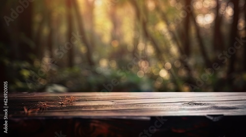 Fototapeta premium Wooden table with blurred background in a lush forest late afternoon light or...