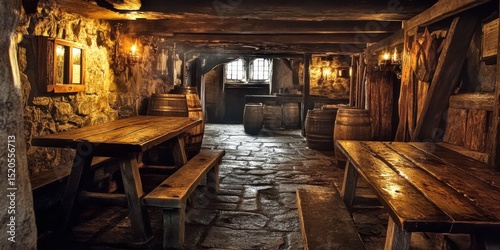 © Agri, Naklejka premium Wooden tables and benches in a historic cellar.