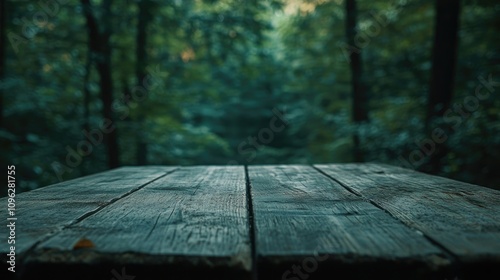 © Rizvan, Fototapeta premium Wooden tabletop in the foreground with a soft-focus dark green forest scene in the background, creating a serene and natural atmosphere.
