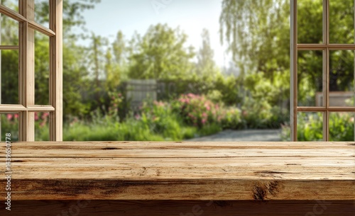 © Muhammad, Fototapeta premium Wooden tabletop with garden view