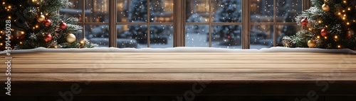 © Farid, Naklejka premium Wooden tabletop with winter window view.