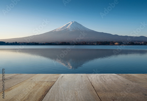 Fototapeta premium wooden terrace and mount fuji in the early morning with reflecti