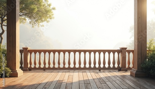 © Viktor, Obraz premium Wooden terrace with balustrade overlooking soft focus misty landscape. Architecture includes columns wooden floor, railing. Natural light, calm mood on patio at sunrise. Serene morning view from