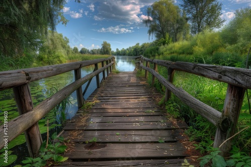 Fototapeta premium Wooden Trail near Lake, Wood River Path Landscape, Old Water Bridge, Pond...
