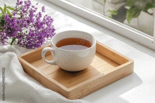 © NASH, Obraz premium Wooden tray with tea and flowers indoors