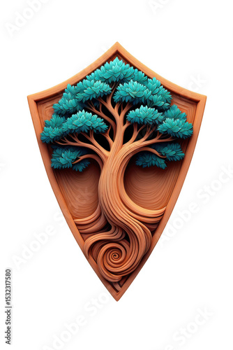 Naklejka premium Wooden Tree of Life Shield Symbol of Growth and Protection in Detailed Carved Art