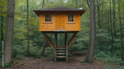 Naklejka premium Wooden treehouse in forest, tranquil scene, nature, outdoors, relaxing, peaceful