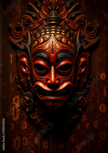 © Nadiya, Naklejka premium Wooden tribal mask displayed on textured wall for Kwanzaa cultural significance