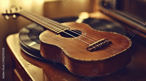 Fototapeta premium Wooden Ukulele on Vinyl Record Player in Vintage Setting