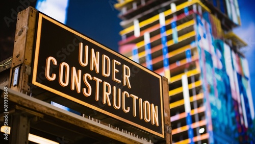 Obraz premium Wooden "Under Construction" sign stands out in front of a tall building under...