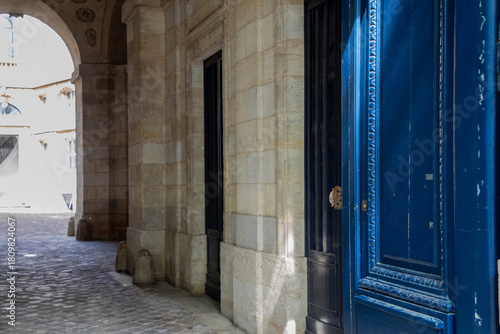 Fototapeta premium wooden vibrant blue door and stone archway in french european courtyard in the old town