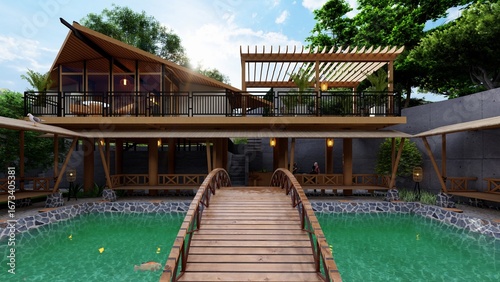 © AriefR_13, Obraz premium wooden villa in the middle of the village, with a bridge over the fish pond