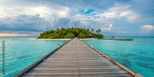 Fototapeta premium Wooden walkway leading to a tropical island paradise under a partly cloudy sky