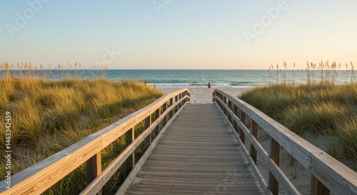 Naklejka premium Wooden Walkway Leading to Sandy Beach at Sunset