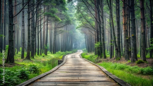 Obraz premium Wooden walkway through a misty pine forest, leading to a tranquil destination