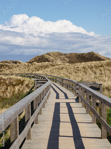 © Anna, Fototapeta premium Wooden walkway through the Dunes at Wenningstedt beach on the German North Sea island Sylt