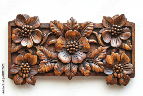 © Birzhan, Fototapeta premium Wooden wall hanging adorned with vibrant artificial flowers and green leaves; creates a charming and nature-inspired decor piece.