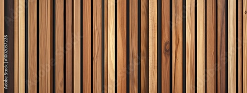 © Five Million Stock, Naklejka premium Wooden wall made of vertical panels. Line slats made of wood for a modern interior. Timber planks for cladding facades or fences. Material for cladding in construction.