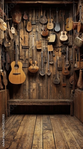 © Iswanto, Naklejka premium Wooden wall with string instruments
