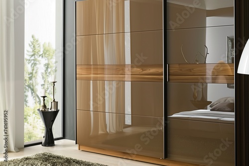 Fototapeta premium Wooden wardrobe with glossy sliding doors in minimalist style interior design...