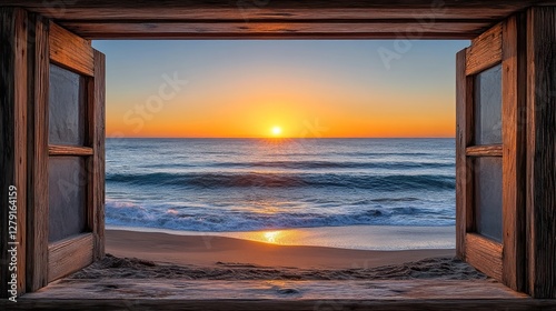© Biancaart, Fototapeta premium Wooden window frames ocean sunrise beach view