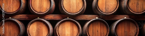 © sangkribo, Fototapeta premium Wooden Wine Barrels in a Cellar