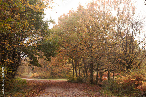 Obraz premium Woodland crossroads in mist & autumn color