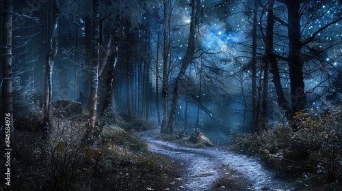 Fototapeta premium Woodland Path through Spring Forest on a Starry Night with Aurora Borealis