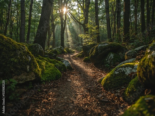 Fototapeta premium Woodland Path with Mossy Rocks and Dappled Sunlight