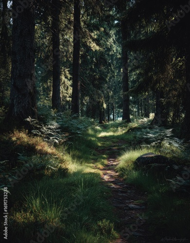 © Peri, Obraz premium Woodland Path with Sunbeams