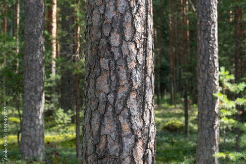 © vkph, Obraz premium Woodland, Pine tree trunks in forest.