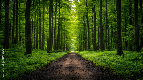Obraz premium Woodland scene showing a dirt pathway through tall trees lined with green...