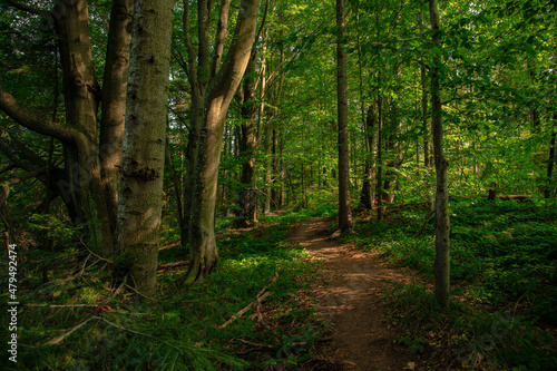 © Artem Kniaz, Naklejka premium woodland summer nature environment space landscape with dirt trail foot path for tranquil and peaceful walking promenade