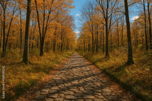 Obraz premium Woodland trail with stone paving under a clear blue sky