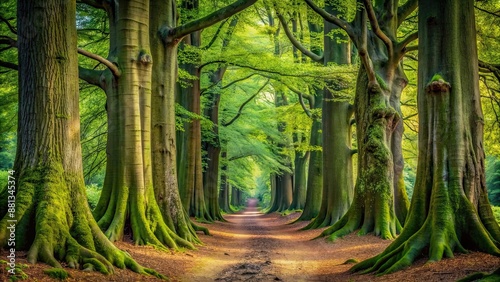 © Udomner, Naklejka premium Woodland walk through towering trees with massive trunks and branches , nature, forest, woods, foliage, giant, massive