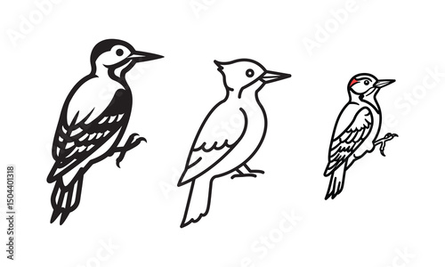 © Bibi, Obraz premium Woodpecker bird simple black line art image, Black bold outline vector icon, Bird vector illustration