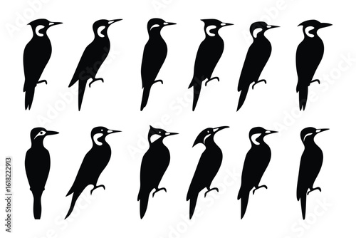 Naklejka premium Woodpecker Silhouettes: A collection of detailed silhouettes of woodpeckers, each poised in various stances. conveying the essence of the bird's striking form.