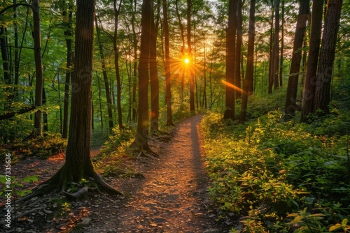 © Alona, Fototapeta premium Woods Sun. Inspirational Sunset View on Hiking Path Through Beautiful Woods