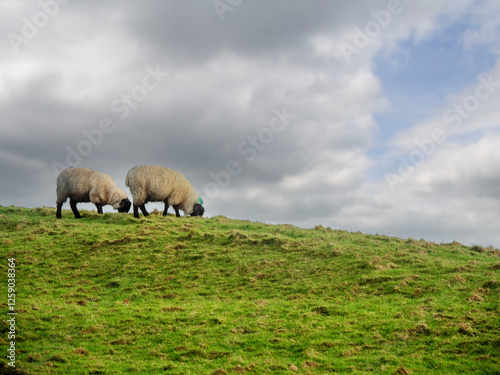 © mark_gusev, Fototapeta premium Wool sheep grazing on a hillside. The sky is cloudy and the grass is green. The sheep are eating grass and looking up at the sky. Agriculture and farming industry.