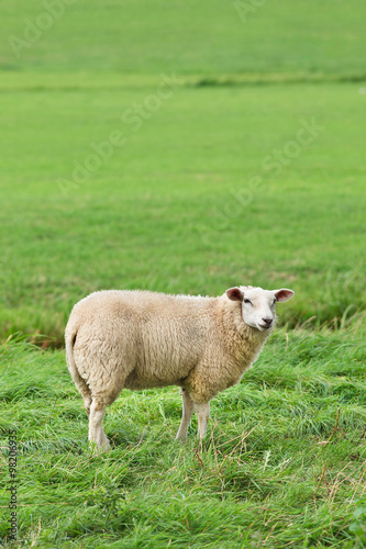 © tonyv3112, Obraz premium Woolly ewe standing in a lush green meadow, The Netherlands