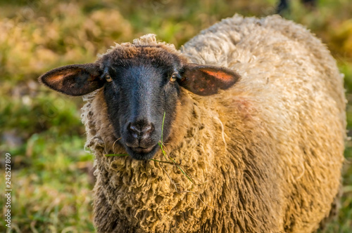 © Mario Plechaty, Fototapeta premium wooly sheep at green meadow season hill