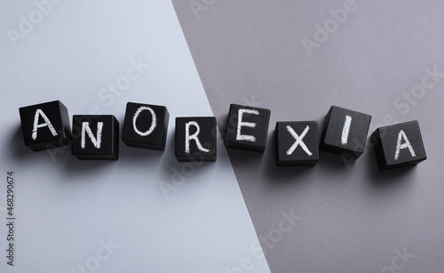 © New Africa, Obraz premium Word Anorexia made of cubes with chalked letters on color background, flat lay