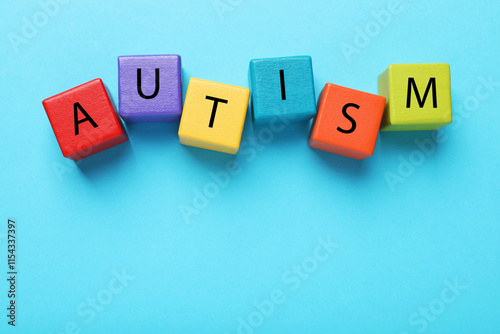 © New Africa, Obraz premium Word Autism made of colorful cubes on light blue background, top view. Space for text