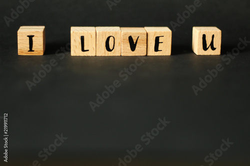 Obraz premium Word concept - I LOVE U build from wooden cubes with letters, selective focus, black background, free copy space