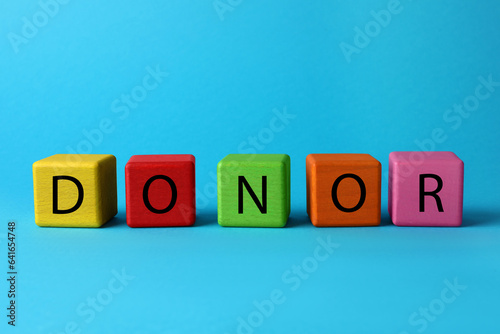 Obraz premium Word Donor made of colorful wooden cubes on light blue background