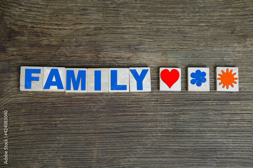 Fototapeta premium word family from volumetric colored letters on a dark wooden background,...