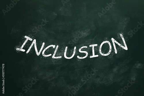 © New Africa, Obraz premium Word INCLUSION written on green chalkboard. DEI concept