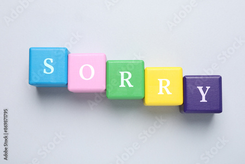 © New Africa, Obraz premium Word Sorry of colorful cubes with letters on light table, top view
