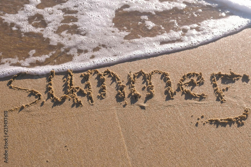 Fototapeta premium Word Summer written in the sea sand. Waves washed away the inscription.