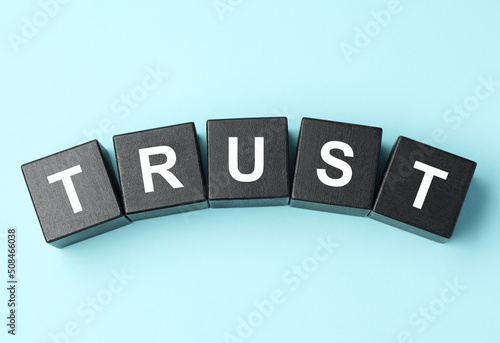© New Africa, Obraz premium Word Trust made of black cubes on light blue background, flat lay